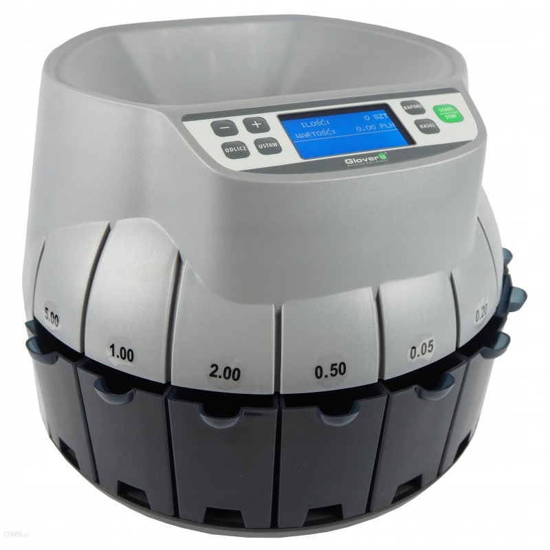 Profesjonalny Sorter do bilonu GLOVER CS-500 to nowa propozycja w ofercie urządzeń tej marki. Urządzenie służy do sortowania i liczenia wartościowego bilonu, za jego pomocą możemy usprawnić i przyspieszyć niewygodny proces obsługi monet. Po skończonym procesie sortowania na wyświetlaczu LCD mamy podaną łączną wartość przeliczonego bilonu oraz ilość i wartość monet dla poszczególnych nominałów. Sorter przystosowany jest do sortowania i liczenia 8 nominałów: bez monet 1 groszowych lub po przeliczeniu monety 1 groszowe automatycznie zostają umieszczone w ostatnim pojemniku. W tej klasie produktów CS-500 wyróżnia się większą prędkością liczenia, większymi pojemnikami na bilon, wyświetlaczem LCD umożliwiającym przegląd pełnego raportu o przeliczonych monetach oraz pełną komunikacją z użytkownikiem w języku polskim. Urządzenie Glover CS-500 to nowa jakość na polskim rynku w segmencie sorterów do bilonu. Sorter jest urządzeniem ORYGINALNYM.